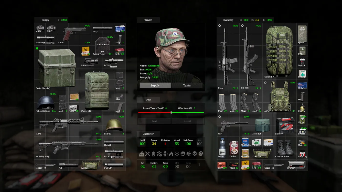 Вы начинаете в относительно спокойной зоне, но чем дальше продвигаетесь, тем опаснее становится. Нужно следить за голодом, жаждой, температурой, ранениями и усталостью. Исследуйте дома, брошенные деревни и трупы, торгуете с немногочисленными торговцами, выполняете их задания, чтобы открыть новые укрытия. Оружие можно кастомизировать, но патроны и еда всегда в дефиците. Бои реалистичные: враги бьют жёстко, часто с большого расстояния, и иногда их почти не видно в лесу. Погибнув, вы теряете всё — инвентарь и прогресс сбрасывается, поэтому каждый выход за пределы укрытия ощущается по-настоящему рискованно.